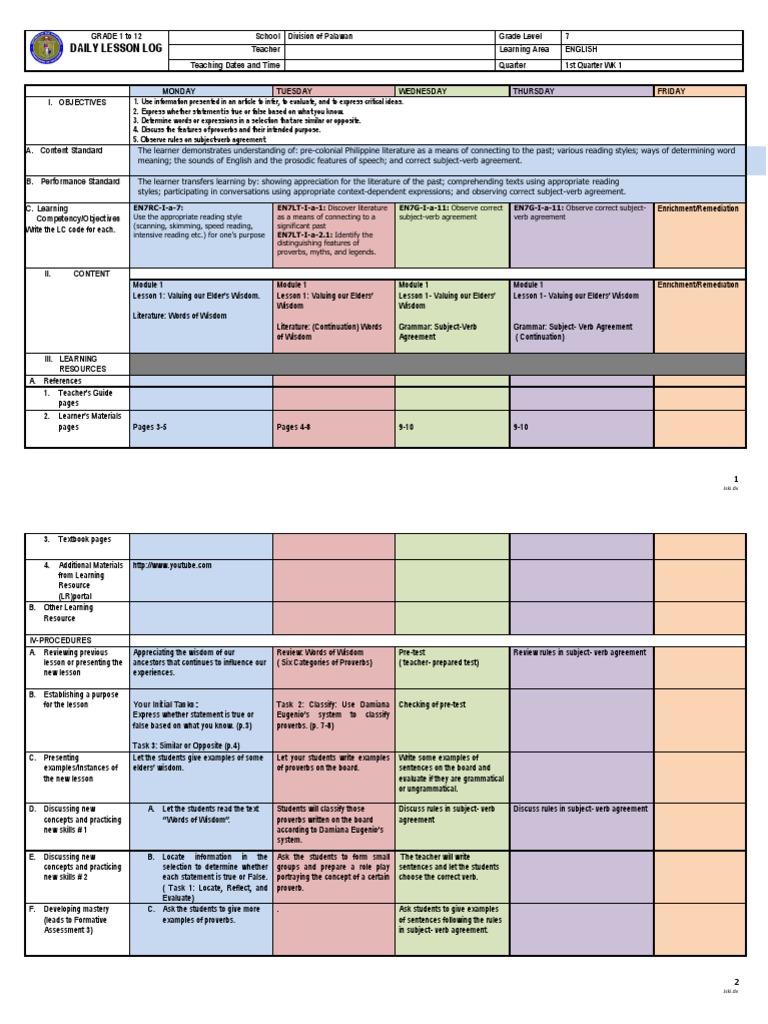 Dll Grade 7 Lesson 1 Quarter 1 Pdf Subject Grammar Proverb