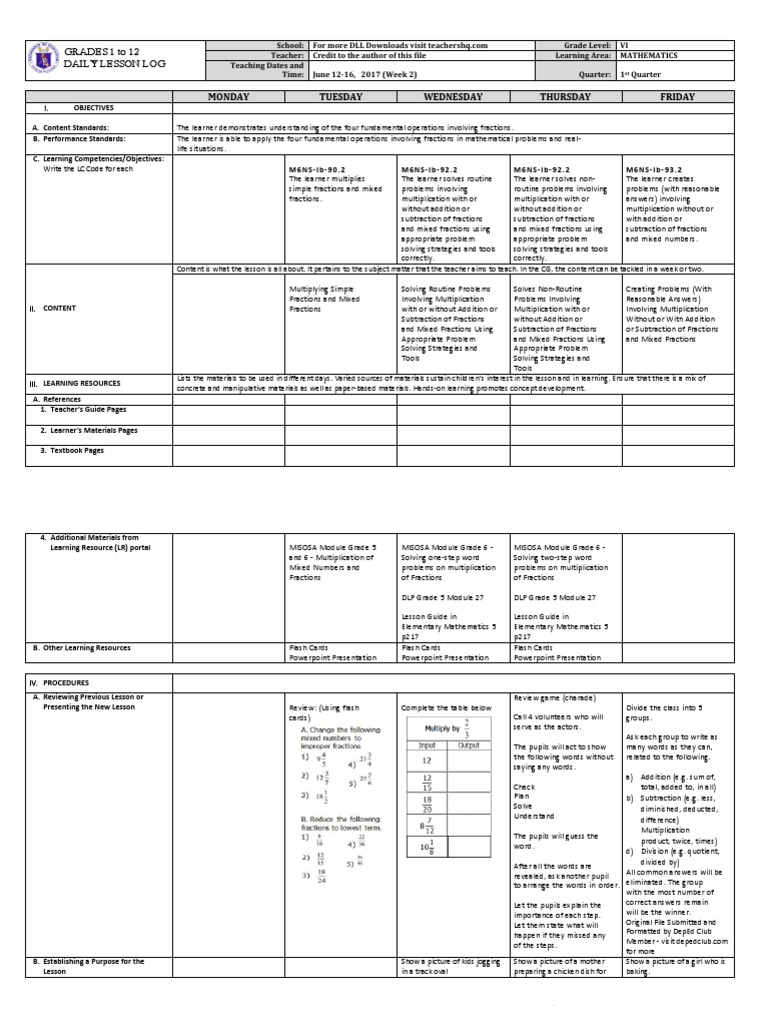Grade 6 Dll Math 6 Q1 Week 2 Pdf Fraction Mathematics Multiplication